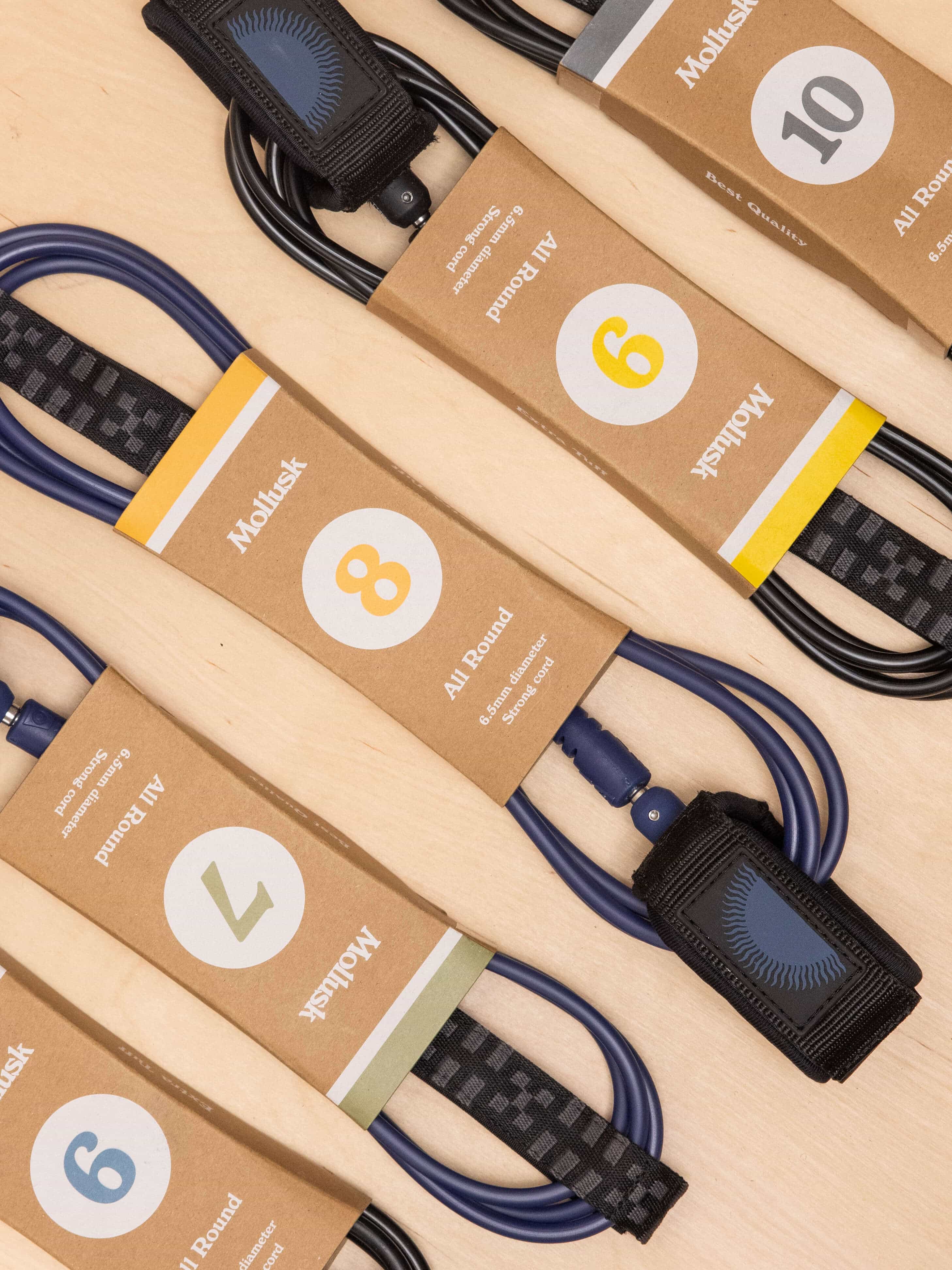 6, 7 oder 8 Fuss lang und mit einem gemusterten Tail-Guard, der das Brett bei den heftigsten Wipeouts schützt. Die Manschette rutscht dank einer Silikon-Beschichtung nicht am Fussgelenk herum. Das Drehgelenk (Swivel) widersteht dem Salzwasser und ist super robust.