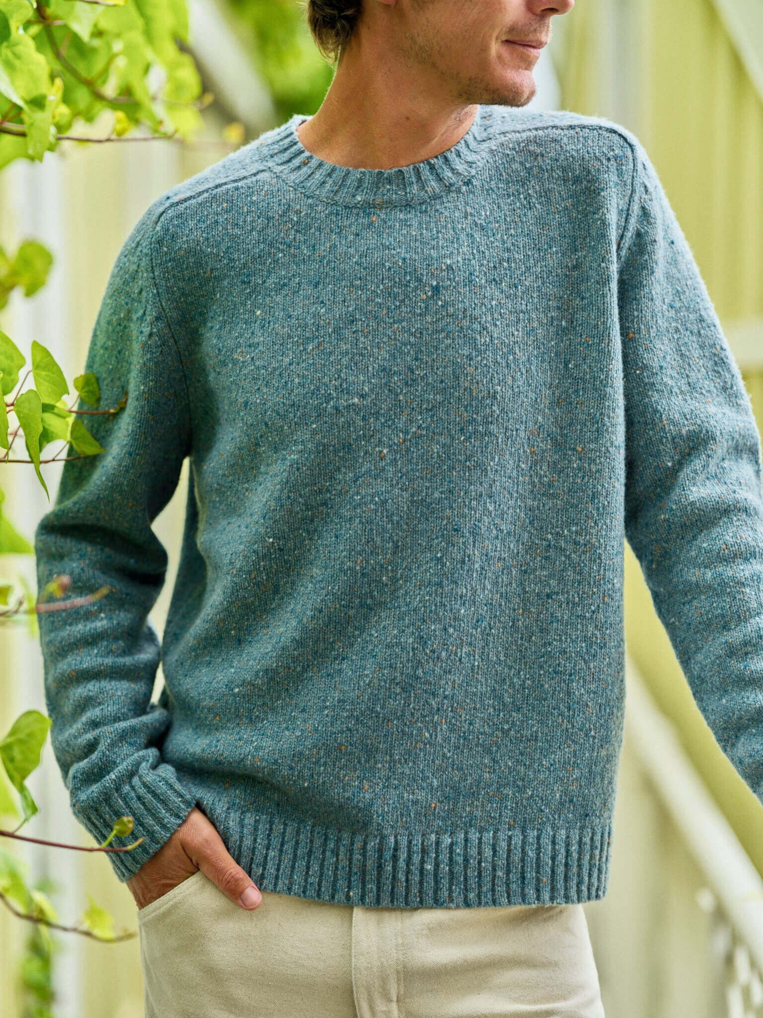 Der türkise Cambridge Sweater von Mollusk aus einem Merino-Mix ist ein eleganter und treuer Begleiter. Er ist sportlich, weich und doch sehr langlebig. So einen Pullover kauft man eigentlich nur alle zehn Jahre. Trotzdem gehen sie weg wie warme Semmeln.