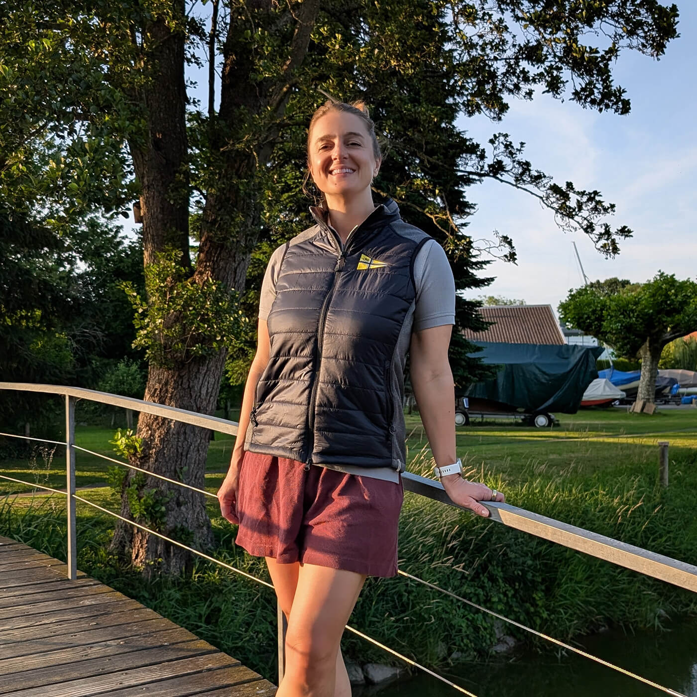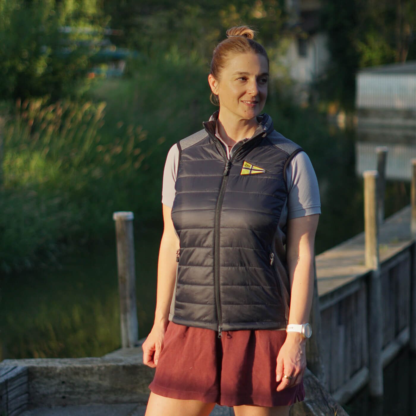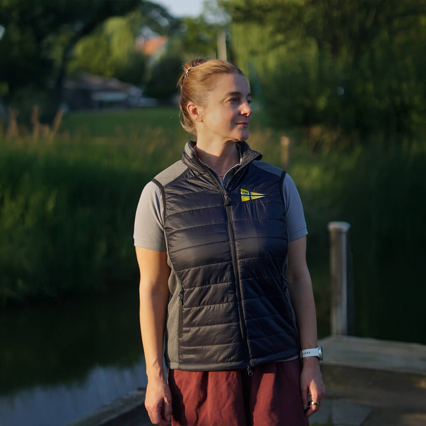 Leichte, wasserabweisende und atmungsaktive Weste für Damen, bestickt mit dem Wimpel des YCRo an der Brust und dem Schriftzug am Rücken. Die Weste verfügt über kontrastfarbige