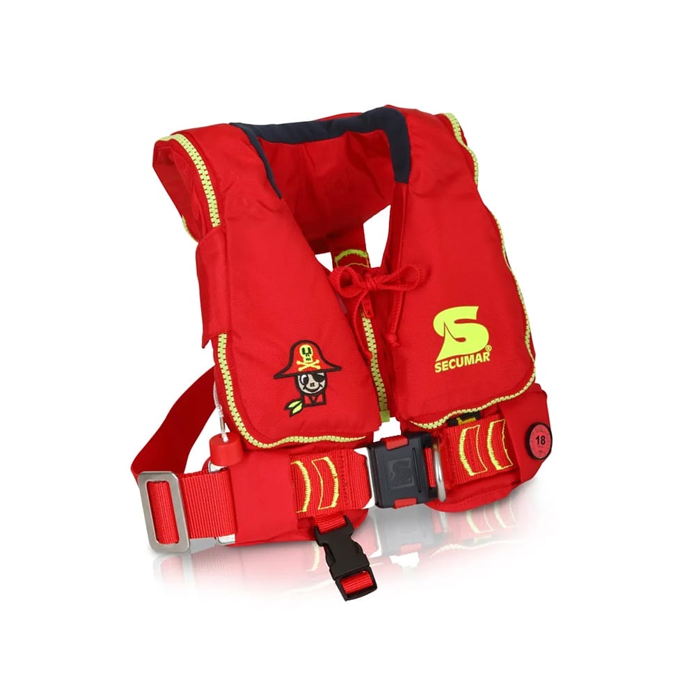 Diese automatisch aufblasbare Rettungsweste der 150N-Klasse ist geeignet für Kinder von 15 bis 30 kg. Mit ihrem Piraten-Design vorne vergnügt die MINI die Kleinen, bietet ihnen durch ein Micro-Fleece im Nacken und einen leichten Reissverschluss vorne allerdings auch hohen Komfort. Die JUNIOR hat ein integriertes Harness (D-Ring) zum Einpicken an Bord. Sie wird wie eine Jacke angezogen und vorne mit einem Click-Verschluss gesichert.